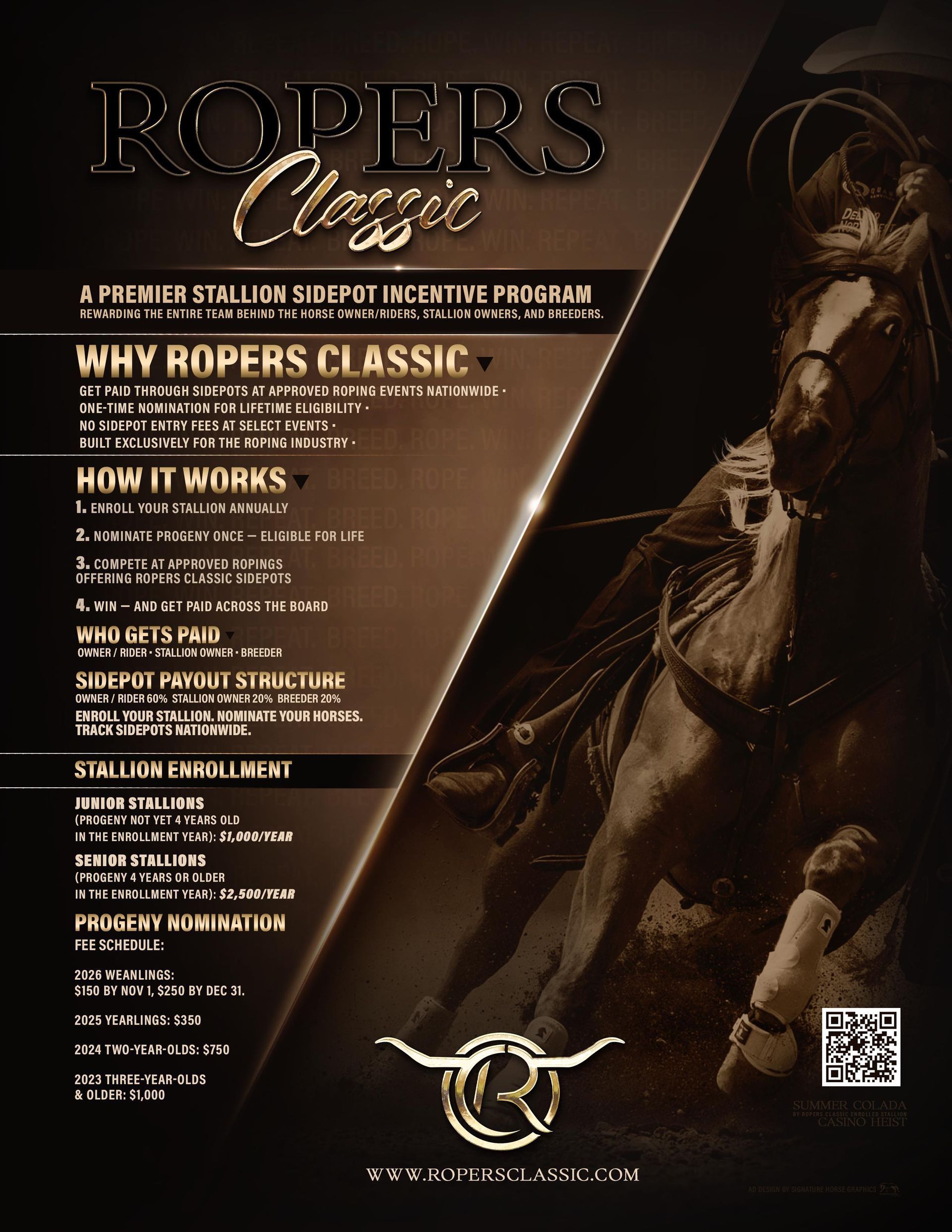 All progeny sired by enrolled stallions can be nominated into the program — and once they’re in, they stay eligible for ROPERS CLASSIC sidepots for life. No renewals. No re-nominations.
